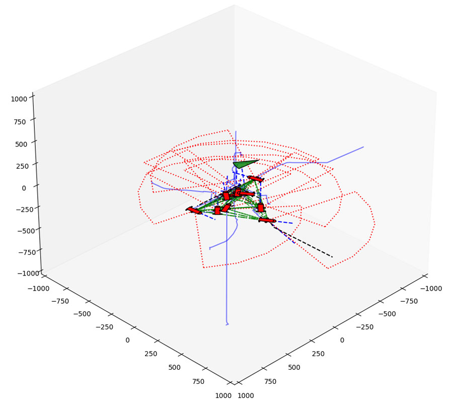در بالا تصویر خروجی مراحل پایانی شبیه سازی آورده شده که با مقایسه این دو تصویر، میتوان به وضوح عملکرد الگوریتم AFSA در همگرا کردن رباتها به یک هدف یا نقطه مشترک را مشاهده کرد: