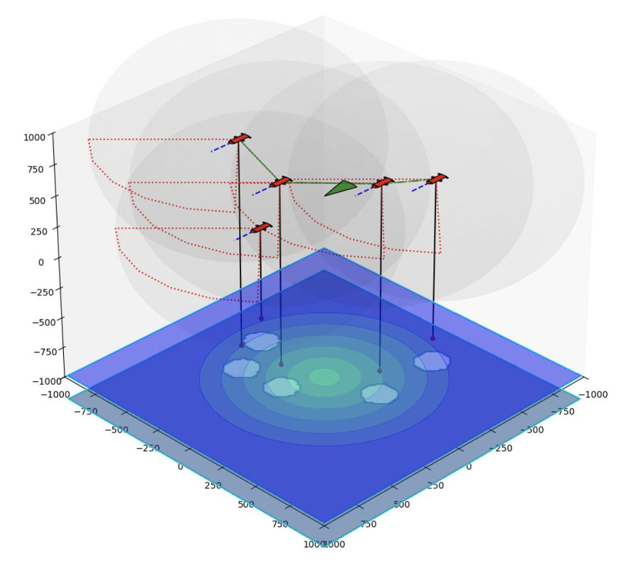 این تصاویر، خروجی شبیهسازی الگوریتم سطح پتانسیل را در یک محیط سهبعدی برای رباتهای جمعی نشان میدهند. در این رویکرد، محیط با یک تابع پتانسیل پوشانده میشود که رباتها با حرکت در جهت کاهش پتانسیل (یا شیب منفی) به سمت اهداف و دور از موانع حرکت میکنند. این روش به ویژه برای مسائل پوشش و مسیریابی در محیطهای پیچیده کاربرد دارد و همانطور که توضیح داده شد حوزههای سبز زنگ دارای بیشترین گرادیان و نشان دهنده حضور هدف در آن ناحیه است و در تصویر نخست از مراحل آغازین شبیه سازی رباتها هنوز به سمت هدف سوق داده نشدند ولی در مراحل پایانی شبیه سازی مدل عملکرد بسیار خوبی داشته است و در پایان این بخش به جمع بندی مطالب میپردازیم.