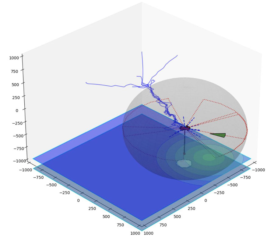 در تصویر ابتدایی اجرای مدل شبیهسازی، ۱۰ ربات هوشمند (نمایش داده شده با اشکال قرمز) بهصورت تصادفی در فضای سهبعدی توزیع شدهاند. نقطه سبز رنگ در مرکز نشاندهندهی هدف (ماهی) است که رباتها مأمور شناسایی و نزدیک شدن به آن هستند.